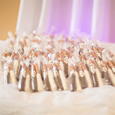 Guests of all ages will enjoy these chocolate-covered pretzels. Pretzel rods or sticks dipped in chocolate and decorated in bride and groom attire are perfect winter wedding favors for this time of year.