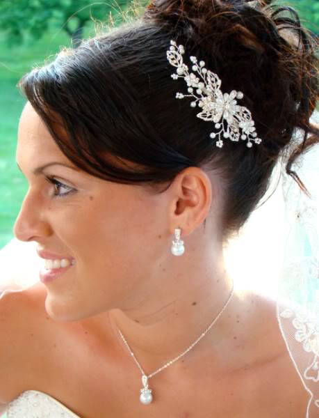 The Pearl Fantasy Couture Bridal Comb is rich with detail and texture! Set against long loose waves or tucked into an updo, this sparkling spray of glittering foliage is enchanting. The amazing floral design is made of luminous faux pearls surrounded by seed beaded clusters and flower and leaf details encrusted with sparkling rhinestones. It’s truly an elegant finishing touch to your bridal hairstyle, that can be worn with a variety of hairstyles and works especially well as side comb. This couture bridal comb is also perfect for tucking into swept-up locks.