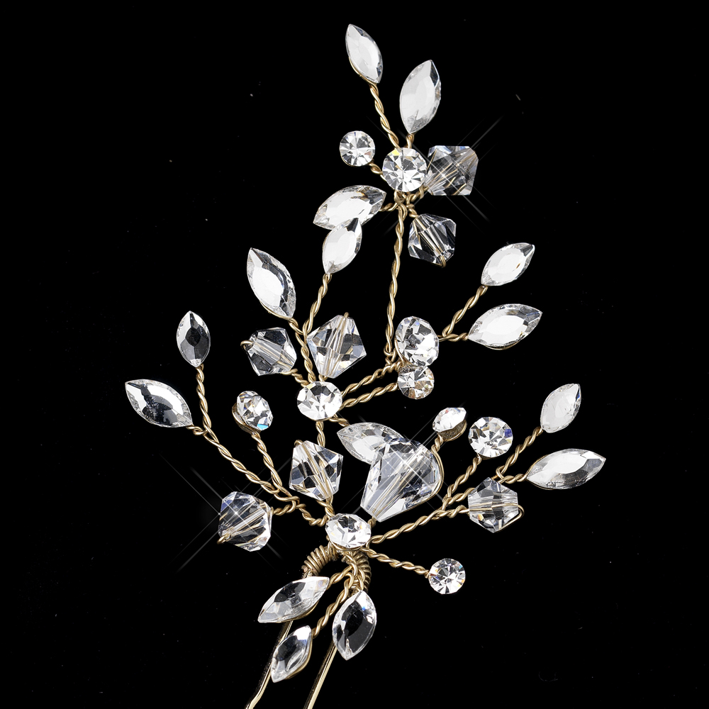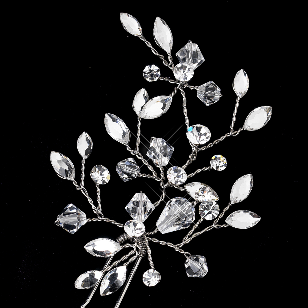 Simply exquisite, the Austrian Crystal Leaf Wedding Hair Pin is a beautiful arrangement of Austrian Crystals and scattered accents of Rhinestones that makes the perfect blend of sparkling components for a special occasion hairstyle. Simply insert this double pronged accessory into the side of any updo hairstyle for a touch of elegance and glamour.  In most cases, three or more hair pins are needed for a fully complimenting look. The 3″ x 2″ ornate rests on two 2-1/4″ prongs for maximum security and comfort into the hair.