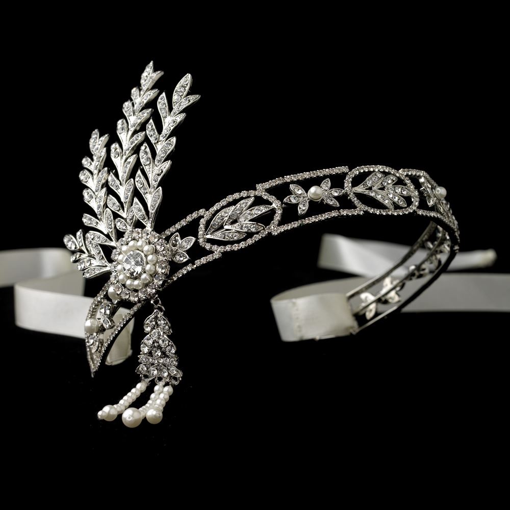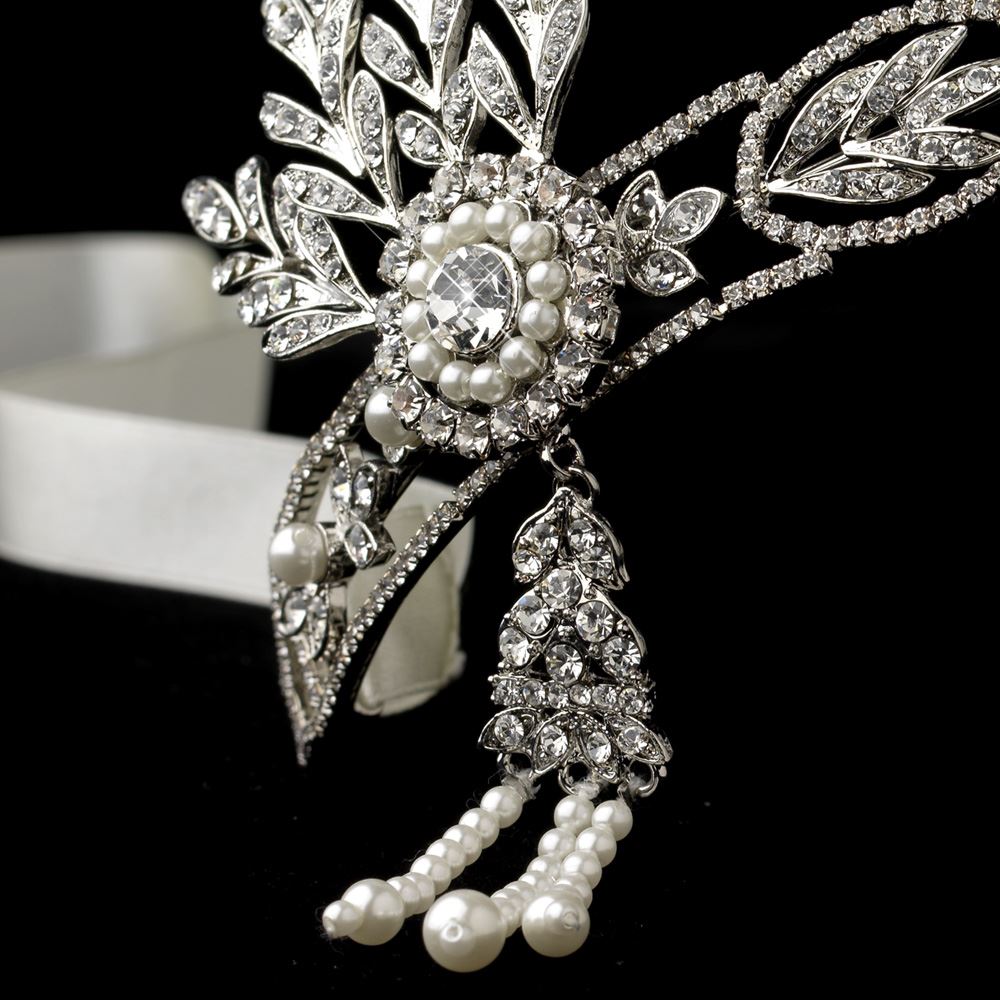 Cinched with a satin ribbon, the Breathless Great Gatsby Inspired Headband Halo is a vintage-style wedding headband elegantly described in crystals, ivory pearls, and light rhodium. This Great Gatsby inspired headband adds a flicker to your locks and brings a noble aura when worn as either a tiara or to the back of your ‘do. A perfect wedding headpiece, this bohemian adornment features embellishments nestled together to create a whimsical muse-like halo and is a novel choice for the bride who wants to subtly stand out.
