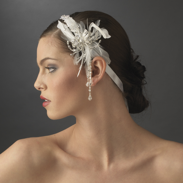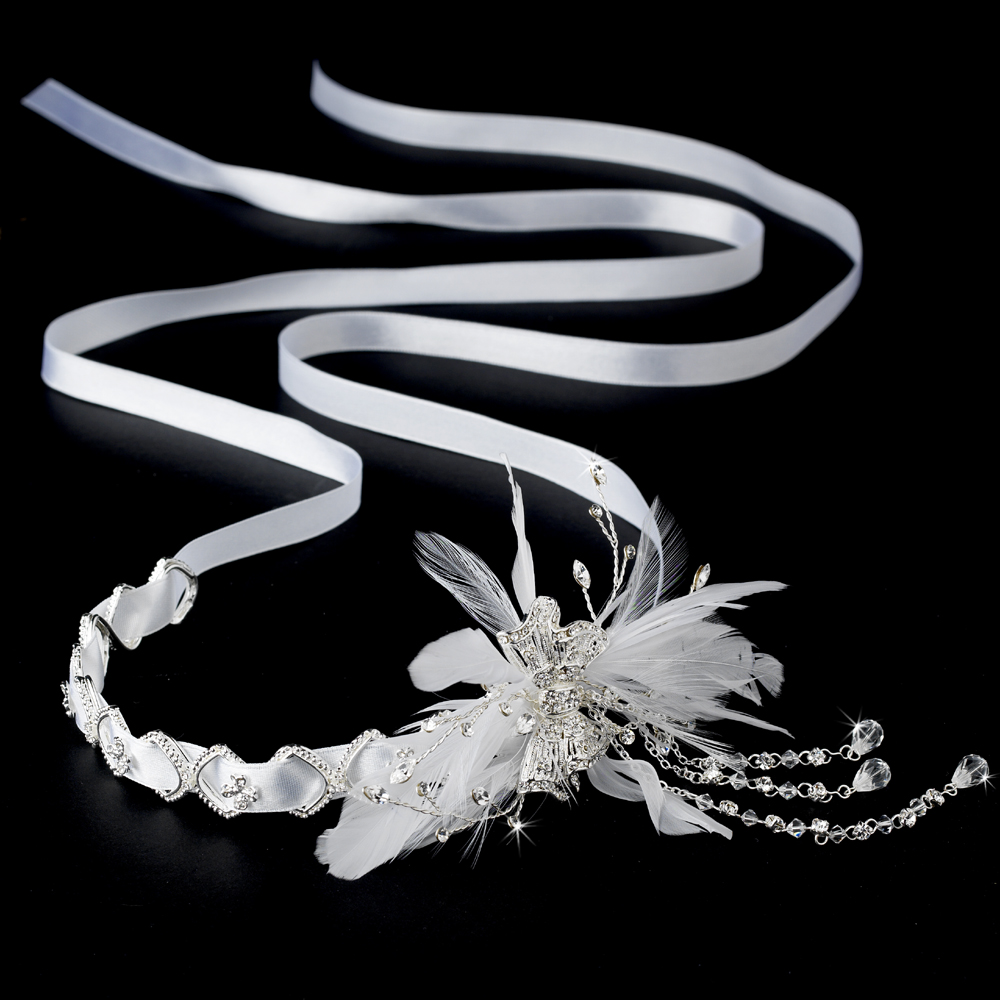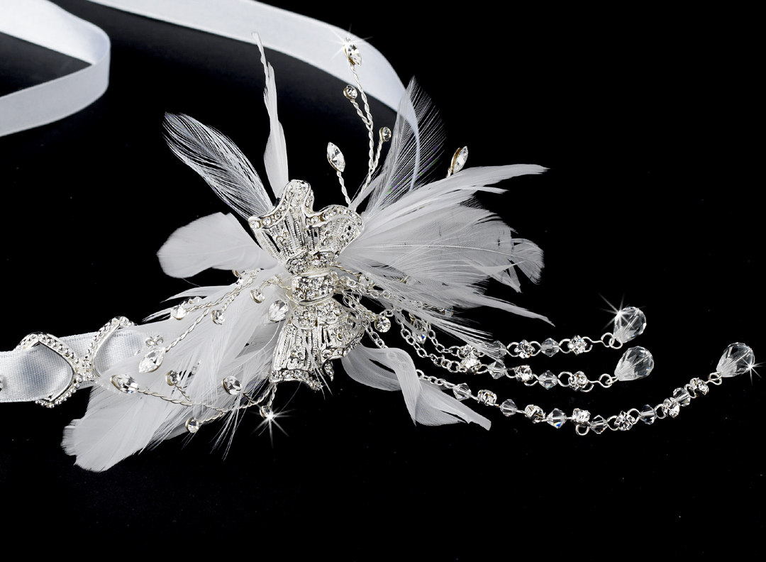 The Vintage Ribbon Bridal Feather Headband is an elegant white satin bridal feather headband that is woven through a silver-plated buckle detail band. It features a stunning silver-plated bow with rhinestone and Swarovski crystal accents. The ornament is set to the side on a bed of feathers. The ornamented portion of this bridal feather headband measures 9-1/2″ wide and 3/4″ tall, and the side ornament measures 4-1/2″ wide and 4-1/2″ tall. The piece is fastened with two 35″ satin ribbons that tie beneath your hair. A chain of rhinestones and Swarovski crystals dangle 3″ from one side of the headband.