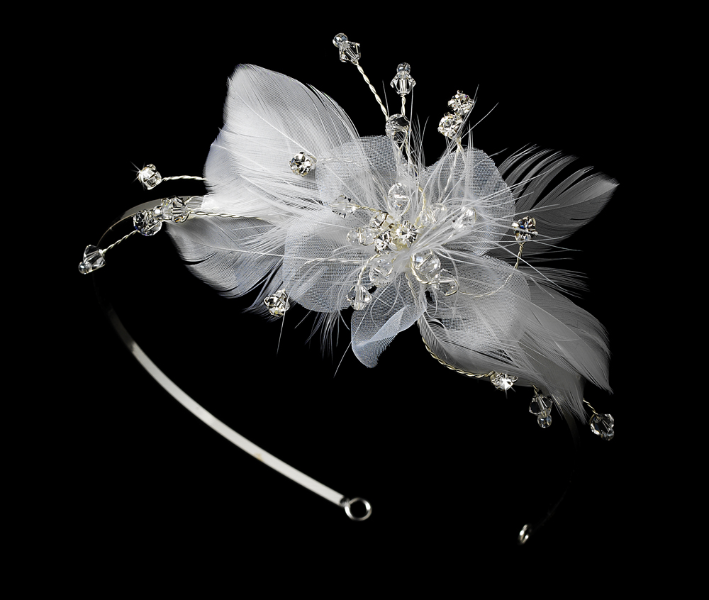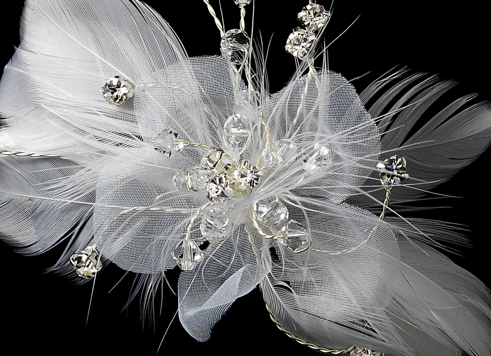 The Romantic Bridal Feather Fascinator Headband is a playful way to add style to your wedding. This lovely vintage-inspired headband features a side ornament of feathers with elegant creamy white floral fabric detailed with rhinestones, beads and Swarovski crystals. The rest of the band sparkles with silver-plating.