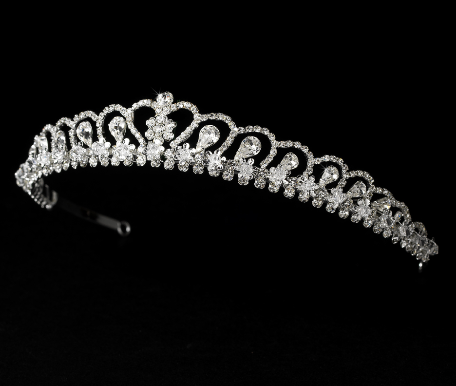 The Bridal Rhinestones Tiara is a beautiful choice for either the modern or classic bride. It’s an extraordinary tiara with a royal-inspired look. It  features over-sized pear-shaped rhinestones with a lovely scalloped edge rhinestone band. The gorgeous rhinestone design is accented with bold swarovski rhinestones. This silver-toned headpiece can be worn with any color gown, but it looks perfect with your white or off-white gown. The ornamented portion of the band measures 9-1/2″ wide and 1″ tall at its center peak, and the piece ends in two loops at each end of the tiara to securely and comfortably fasten the tiara to your hair with bobby pins.