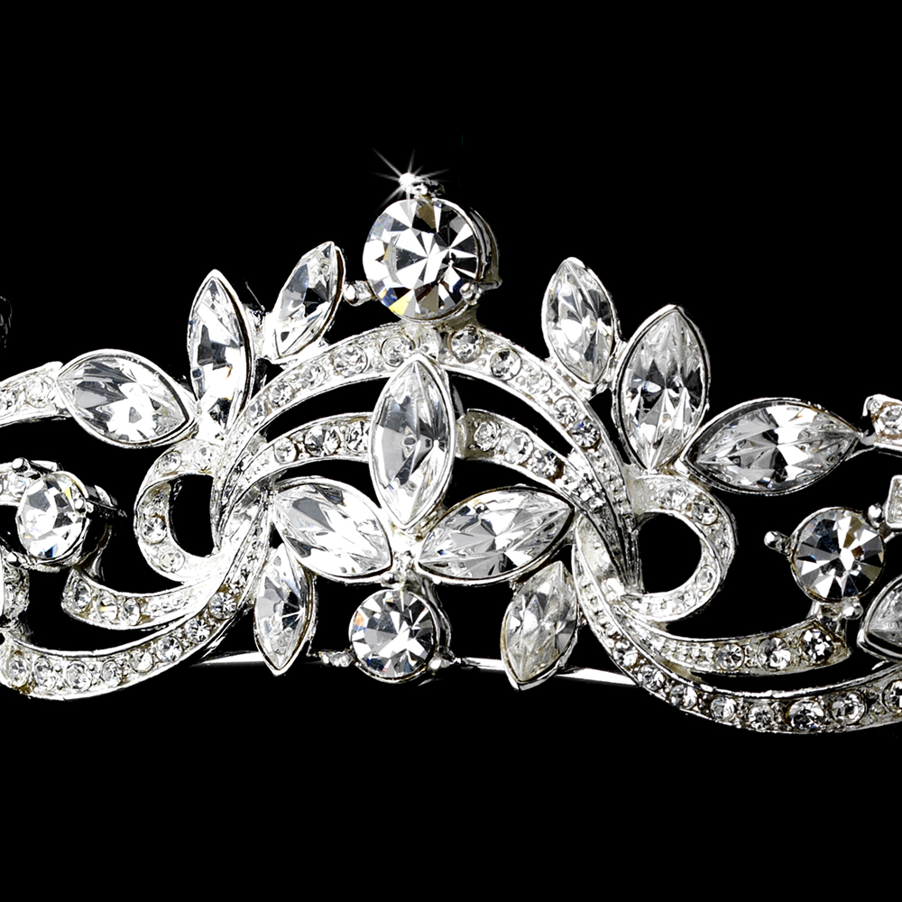 Marquise-cut and round-cut rhinestones are interwoven into the Swirling Crystal Tiara with chic silver-plated swirls into a romantic and classic design fit for the bride’s locks. This elegant crystal tiara adds a flicker to your tresses and will complement your look, without stealing the spotlight from your veil. It’s an ideal choice for a classic, modern or vintage inspired wedding or even for prom! Loops on each end allow for the crystal tiara to be placed as desired and secured with bobby pins, ribbons or ties.
