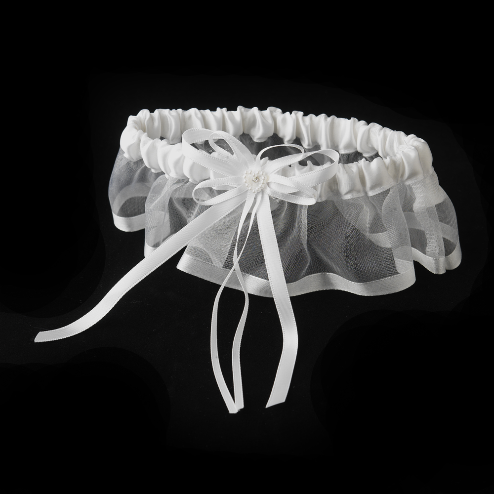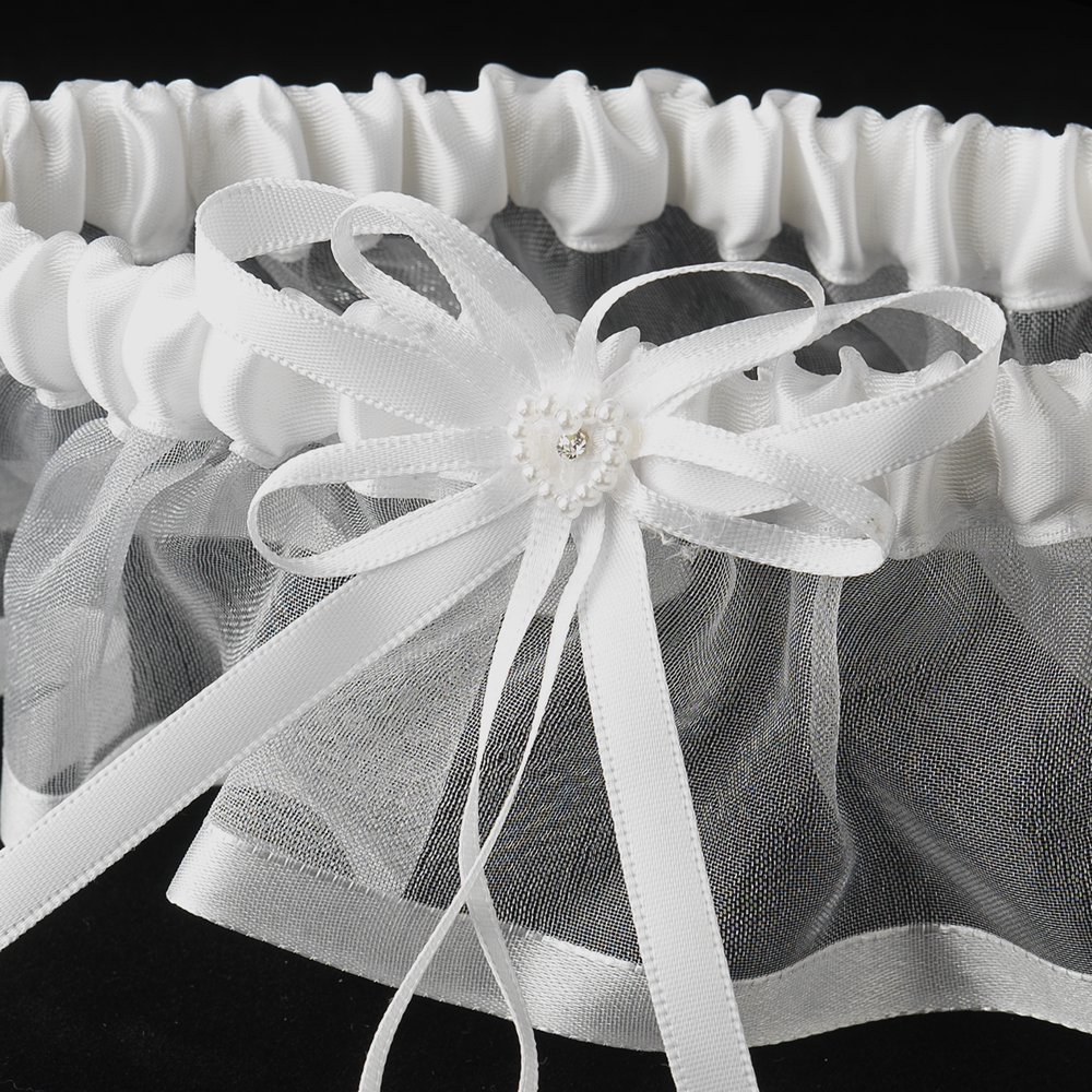 The Sweet Heart Crystal Pearl Garter is a romantic and fun garter. It features alluring sheer organza and is embellished with small pearls heart accent and a single rhinestone in the center of a dainty satin ribbon bow. This lovely crystal pearl garter is the perfect touch of elegance and class. It is the perfect hidden accessory for your special day!Â