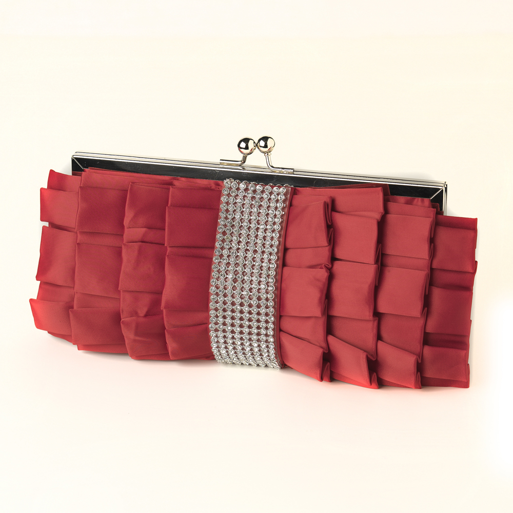 Add a touch of sparkle to your wedding ensemble with this rhinestone-embellished Ruffle Satin & Rhinestone Bridal Purse. This beautiful clutch evening bag is the perfect accessory for your formal outfit. It is pleated into a bow tie decorative satin design that is elegant and classy. Featuring a silver-plated kiss closure with inside side pocket and detachable shoulder-length chain, this bridal evening handbag gives ultimate sparkle and glamour. This is the perfect evening accessory for carrying all of your necessities in style!