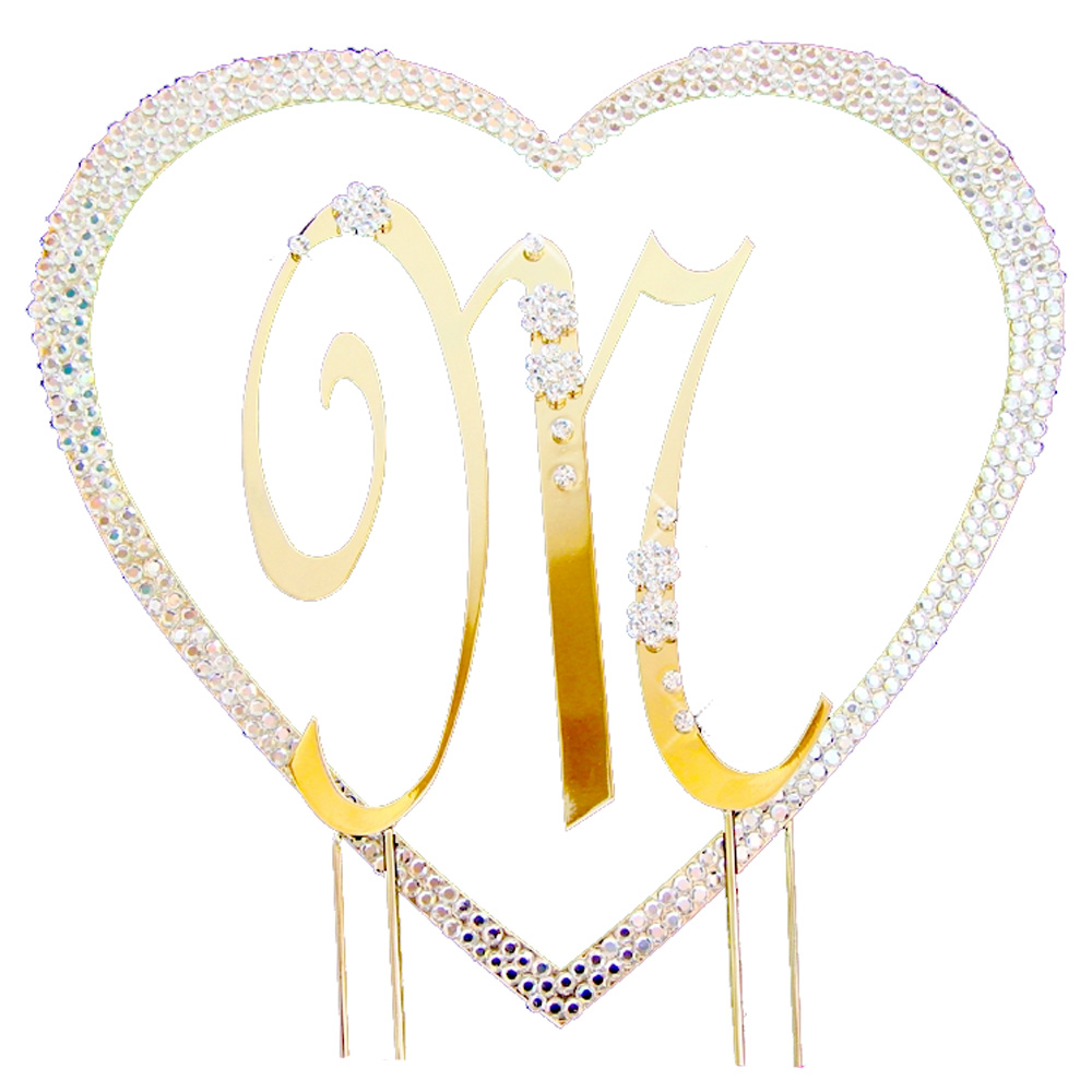 The Swarovski Crystal Initial & Heart Cake Topper Set is available in either Gold or Silver and in large size only. The large heart measures 6-1/2″ wide by 6-1/2″ high. The large letter measures 4-3/4″ high.  The widths vary depending on the different letters. Some letters are wider than others. This cake topper set is the perfect accent for any wedding cake. It’s a modern and inexpensive way to personalize your wedding, anniversary, or other special occasion!