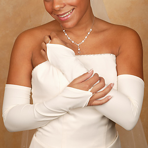 The Simply Elegant Fingerless Matte Satin Gloves can add just the right finishing touch to your bridal ensemble. They look fabulous with any strapless gown and can make your special day just a little bit more special. The gloves have just a touch of spandex to give them a perfect and comfortable fit to any size hand. These fingerless matte satin gloves are lovely and sophisticated, and possess no sheen.