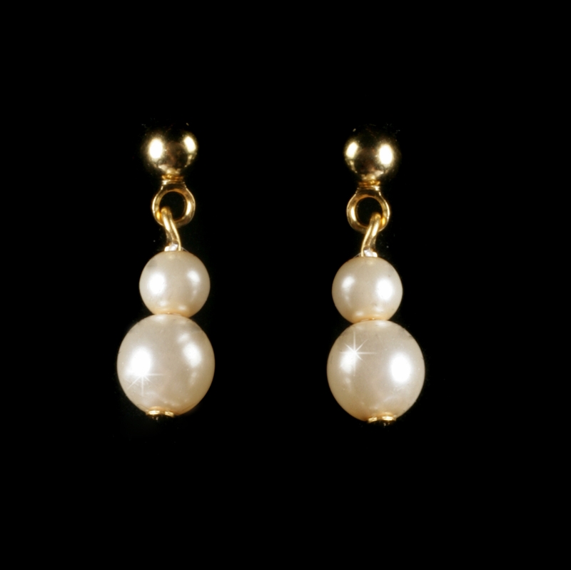 The Pearl Flower Girl Jewelry Set is available in 3 color options – Gold Ivory, Silver Ivory and Silver White. The necklace measures approximately 12″ long, with a 2″ extender chain for just the right fit and lobster claw clasp. The coordinating earrings measure a subtle 3/4″ long and are for pierced ears. The pearls coordinate with both white and light ivory gowns.