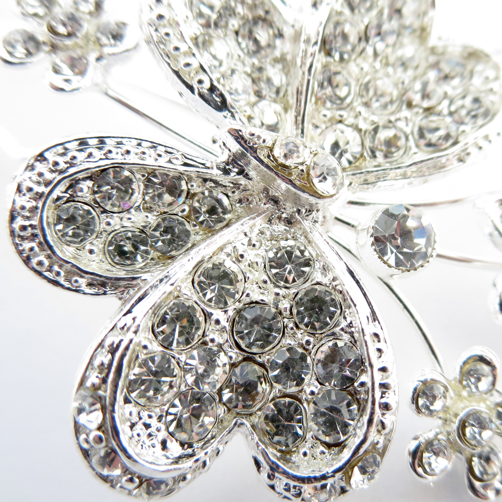 The Nicobar Butterfly Hair Pin sparkles with lustrous silver plating and stunning rhinestones, to tuck into a bun or above your ear. Simply beautiful, it features a rhinestone-encrusted butterfly with sparkling rhinestone flowers. Add a touch of elegance to your hairstyle with this dazzling floral butterfly hair pin.