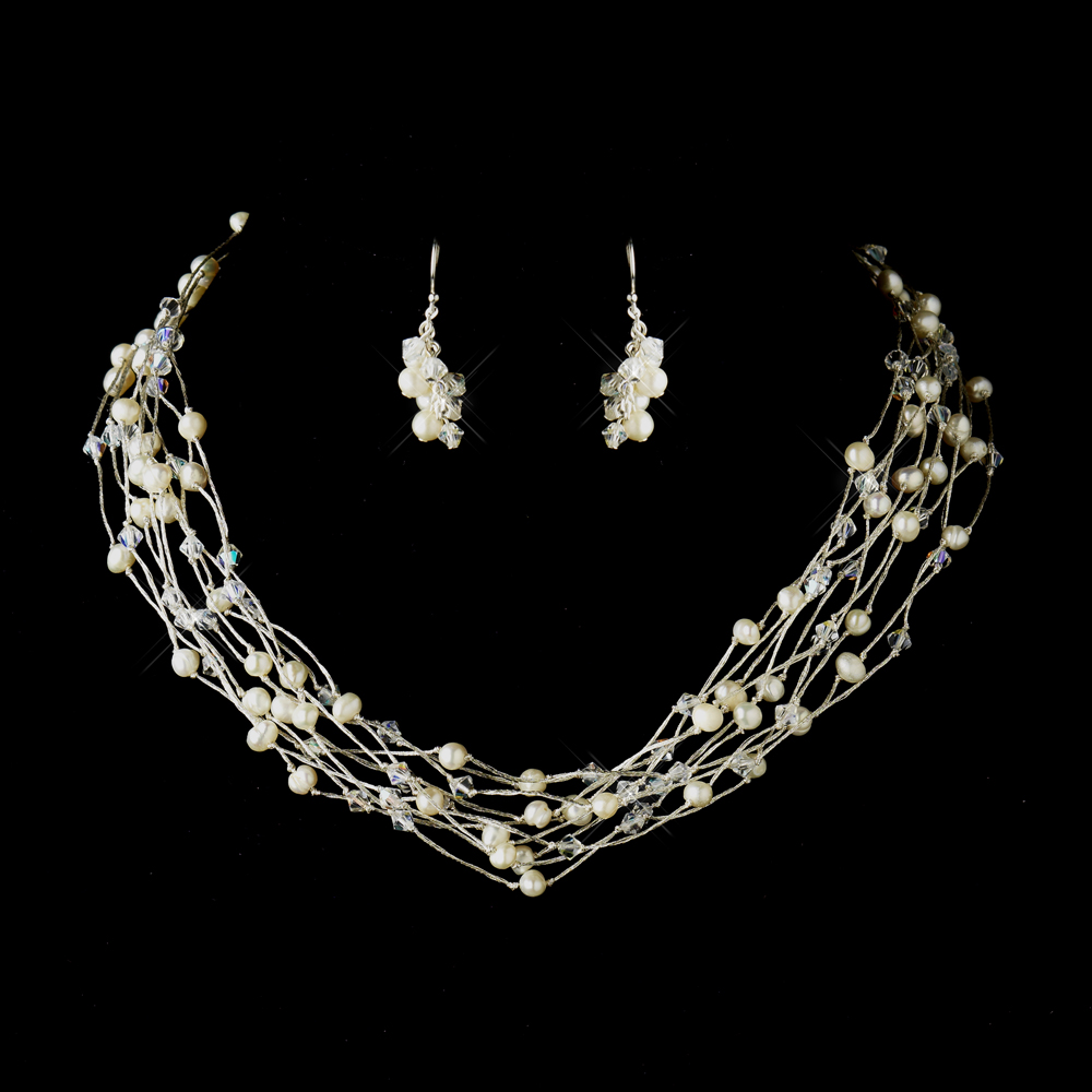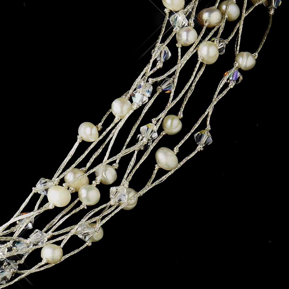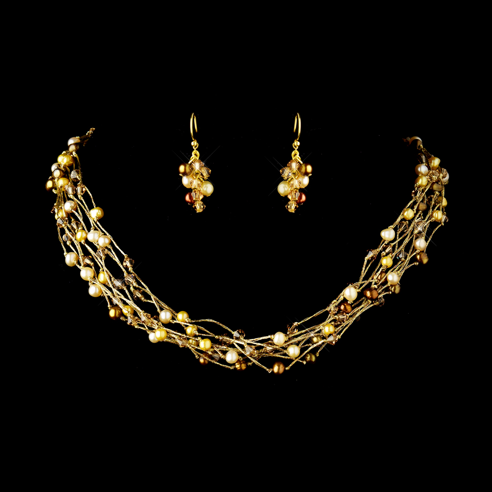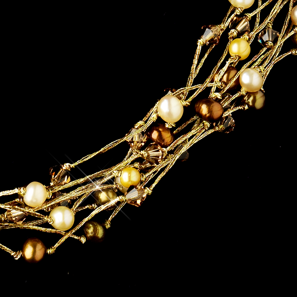 The Gorgeous Pearl & Swarovski Bridal Necklace Set is so delicate with rich textures and deep colors. This fabulous bridal necklace set offers a breathtaking touch of color and is the perfect addition to your wedding, prom, or homecoming! The gold brown set features gorgeous brown Swarovski crystals with hues of glamorous pink and brown fresh water pearls line copper-colored wires making quite the statement. This bridal set would work well for the modern bride with a non-traditional dress, or it would make a fabulous bridesmaid gift!  The silver ivory set features gorgeous ivory Swarovski crystals with hues of glamorous ivory fresh water pearls. The Gorgeous Pearl & Swarovski Bridal Necklace Set lays just beautifully on the neckline.