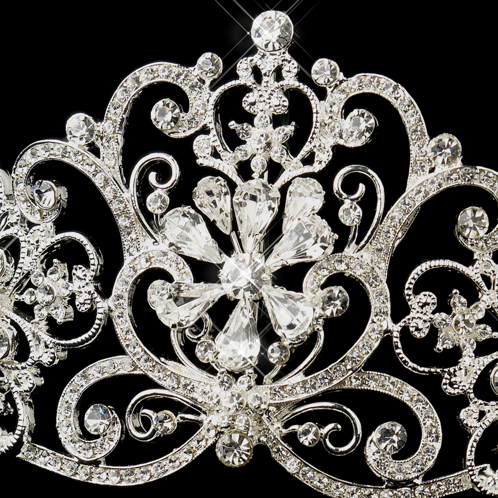 Intricately designed with a curling decorative pattern and beautifully encrusted with sparkling rhinestones makes this royal wedding tiara a fabulous headpiece. This beautiful piece is sure to become a family heirloom! The open back tiara features a silver frame covered with glittering rhinestones, and the frame has loops at each end of the band to help secure the tiara into any updo with bobby pins. The frame of this royal wedding tiara measures approximately 17″ from tip to tip, with the design measuring 11-1/2″ long and the embellishment measuring 2-1/2″ high.