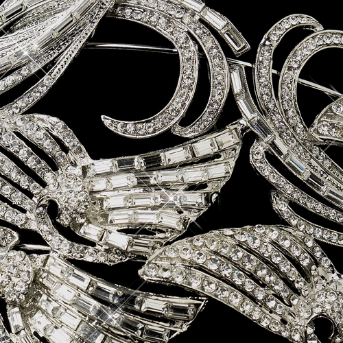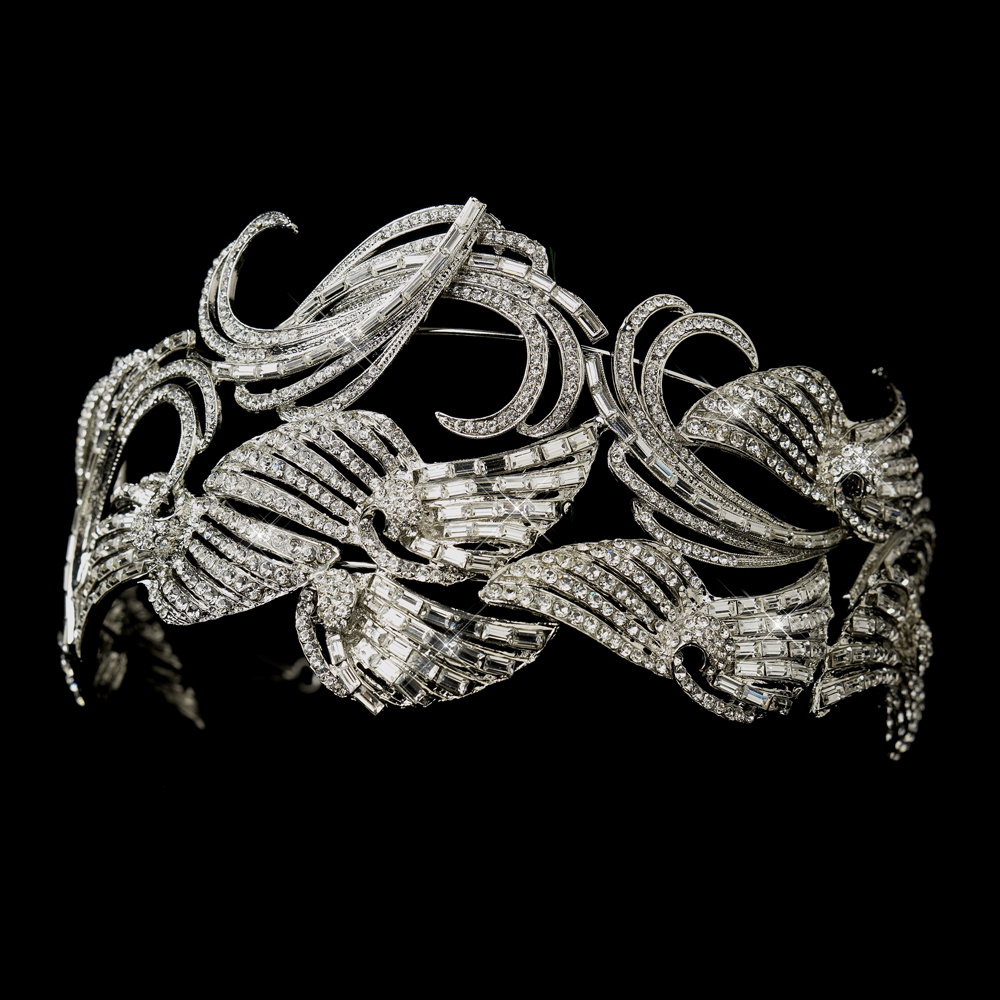 The Royal Silver Clear Multi-Cut Rhinestone Bridal Tiara is absolutely stunning. With rhodium silver plating encrusted with baguette and round cut rhinestones, this royal couture tiara headpiece truly shines.  This glamorous open back tiara features a rhodium silver frame covered with glittering clear multi-cut rhinestones.