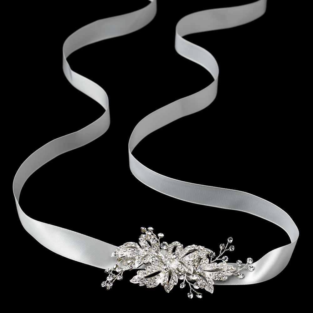 You’ll look absolutely enchanting on your wedding day wearing the Rhinestone Pave Flower Bridal Headband. This elegant ivory ribbon bridal headband is composed of an ivory ribbon that is embellished with an accent flower on the side . The headpiece has remarkable sparkle from dozens of pave rhinestones that adorn the entire flower design, along with a lustrous silver plating. This bridal accessory is tied in the back of the head and can also be worn around the waist as a bridal belt to accentuate the waistline of a wedding dress. There is 95″ of ribbon that can all be used or it can be neatly shortened to the desired length.