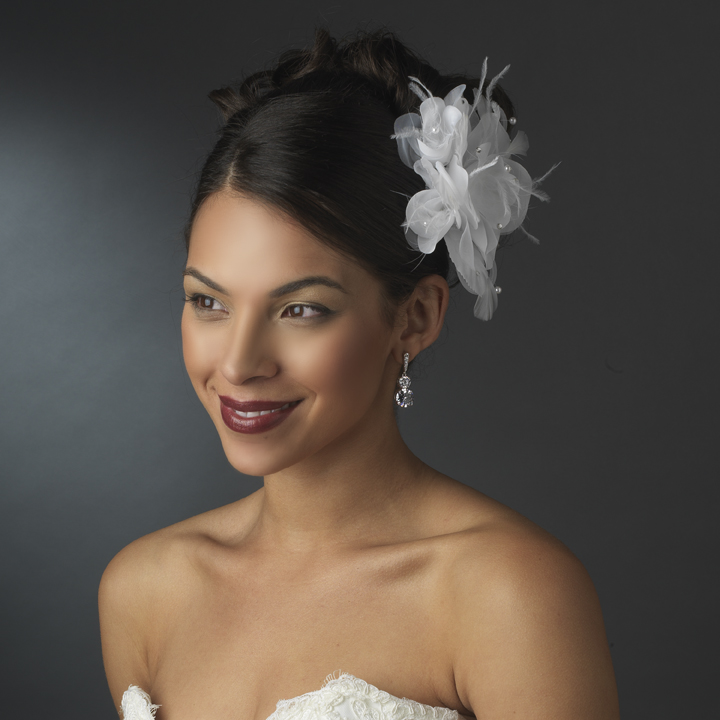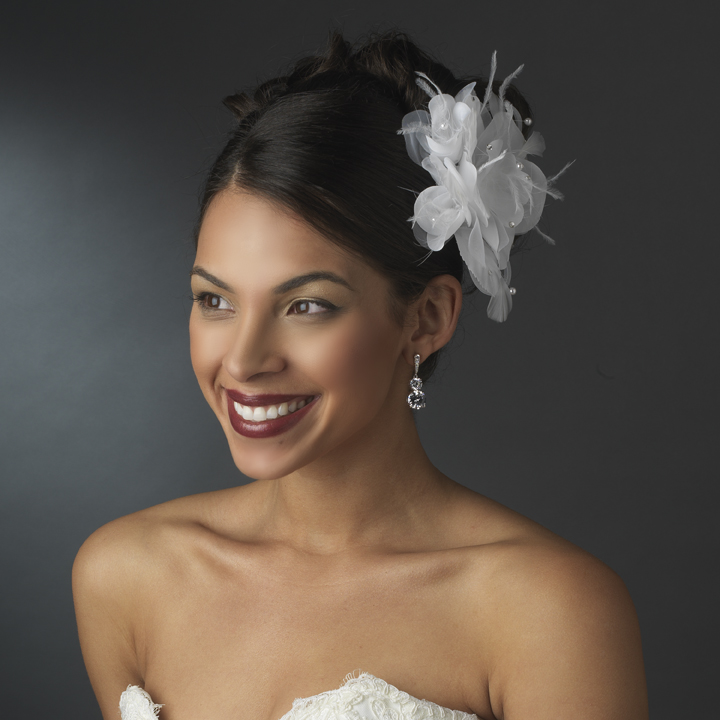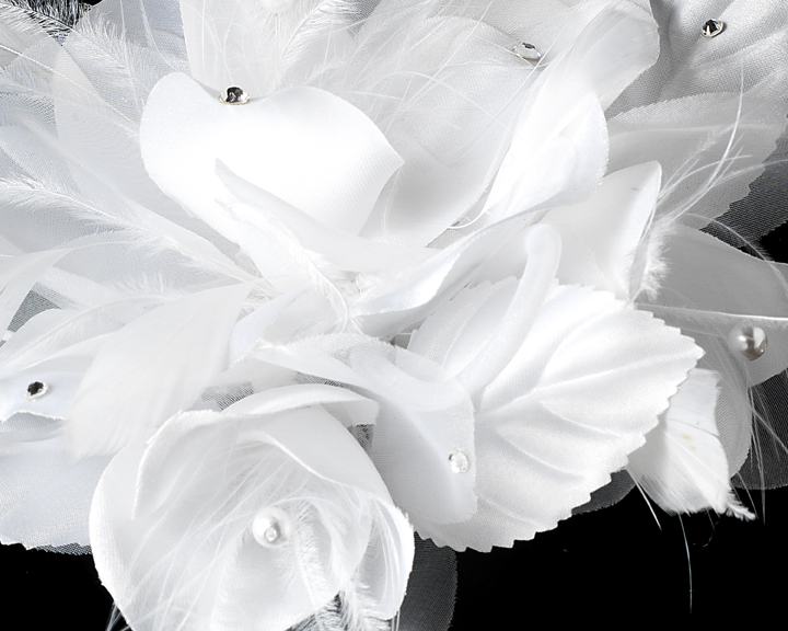 This Crystal & Feather Flower Hair Clip is trendy, edgy and glamorous, and is perfect for the elegant and romantic bride. Portraying pure class, this hair clip is a spring or summer season headpiece that will have family, friends, and guests falling in love with. This elegant headpiece secures easily into the hair with an alligator clip for a secure and comfortable fit into the hair, and it coordinates well with light ivory or white gowns.