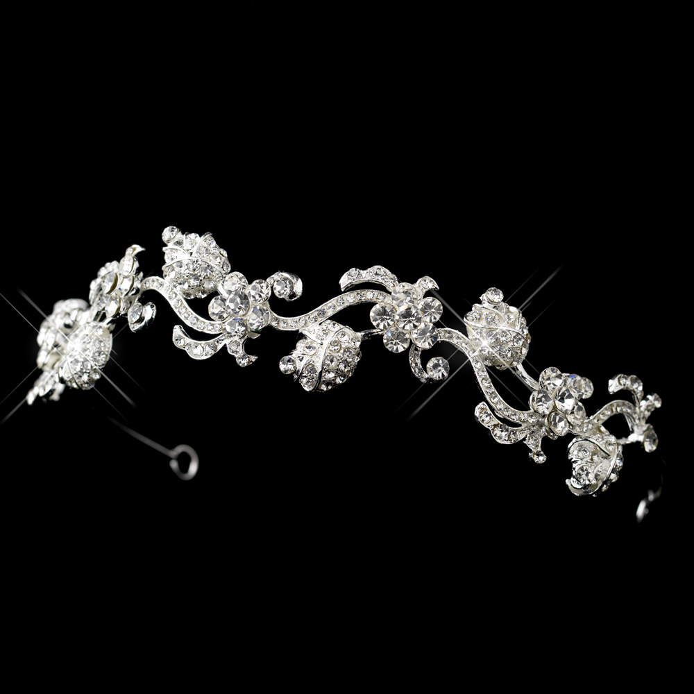 Accessorize your bridal hairstyle with this gorgeous Rhinestone Floral Rose Bud Swirl Headband connected by wave swirl designs. With a rhinestone-encrusted silver-plated band, this beautiful swirl headband is a dainty accessory that will be perfect for all types of special events.