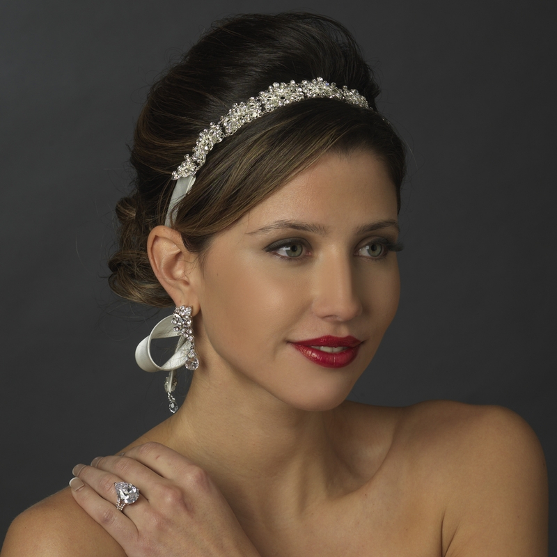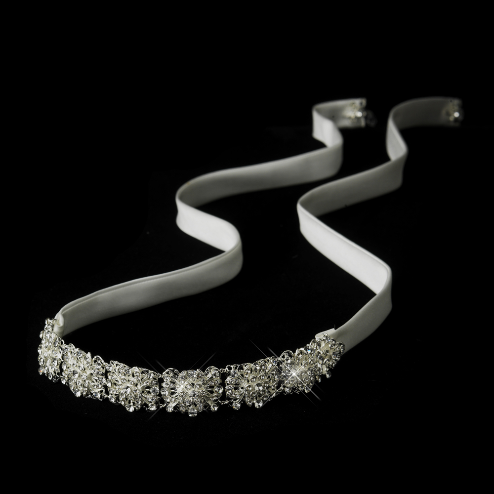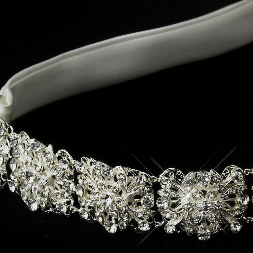 The Vintage Crystal Ribbon Headband is a one-of-a-kind silver crystal ribbon bridal headband that is a striking choice for any classic, modern or vintage inspired bride with an ivory gown. This gorgeous ribbon bridal hair headband is lovely alternative to a bridal tiara, or to a silver or gold headpiece, for your elegant hairstyle on your big day! It features an ivory or white ribbon adorned with crystal-encrusted silver-plated flower designs. These crystal-encrusted silver-plated flower designs are interlinked for flexibility to tie around your hairstyle.