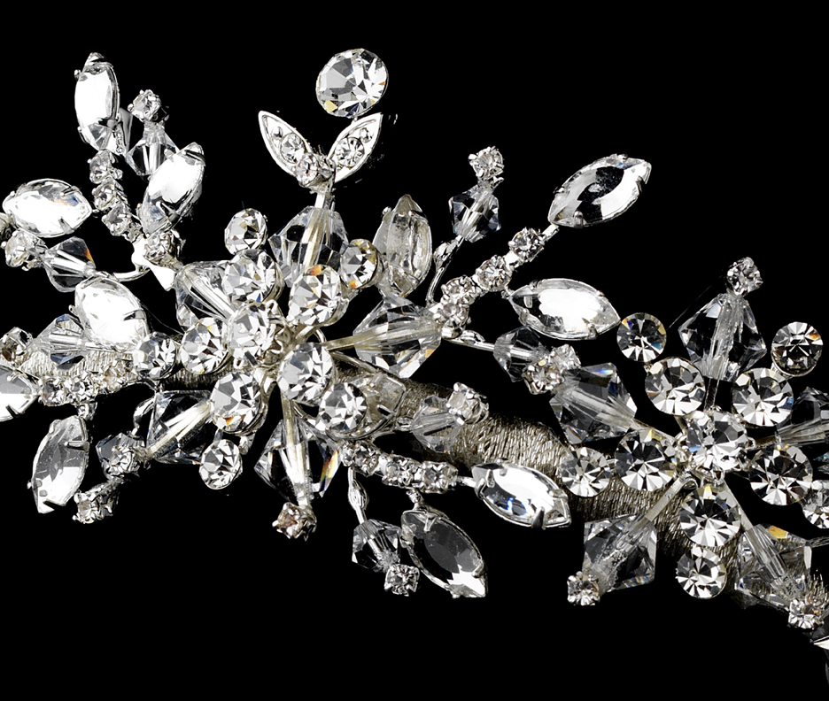 Shimmering bursts of rhinestone and Swarovski crystal flowers make the Swarovski Snowflake Wedding Tiara a perfect addition to your wedding day. The ornamented portion of this snowflake wedding tiara measures 9″ wide and 1-1/2″ tall at its center peak, and a loop at either end allows you to fasten the piece securely and comfortably into your hair with bobby pins.