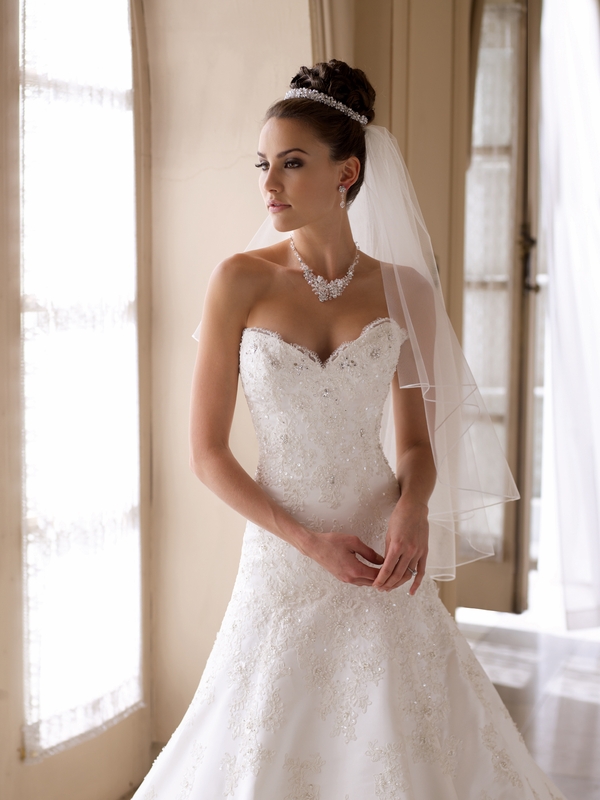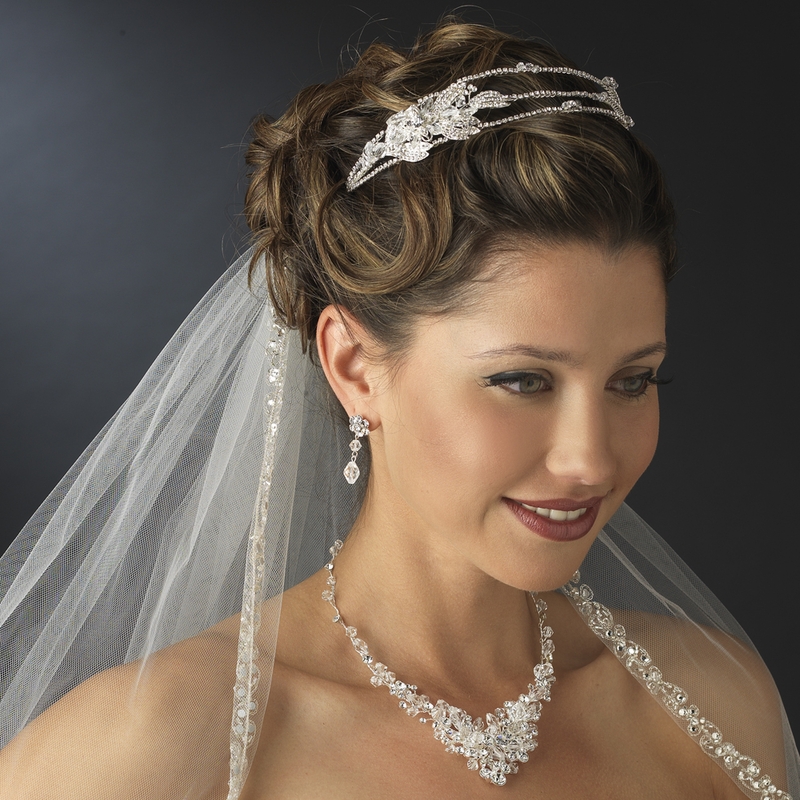 This wedding jewelry set is featured with the Trellis Floral Leaf Headband and the Tisha Beaded Fingertip Veil.