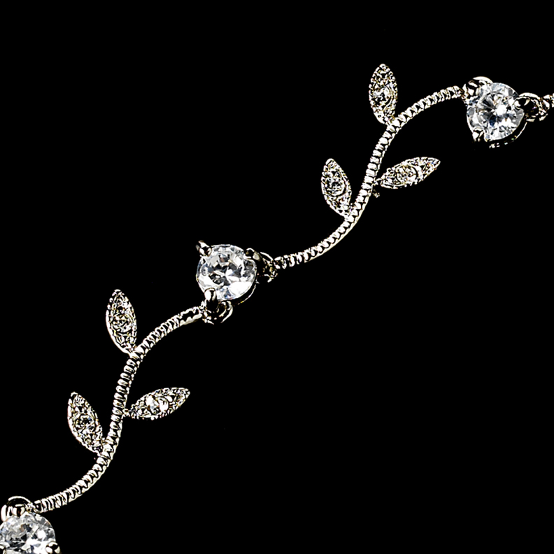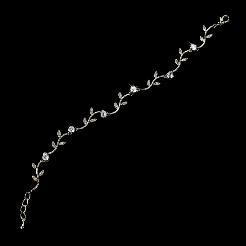 The Embrace Vine & CZ Wedding Bracelet measures 6-3/4″ in length with a 3/4″ extension. The bracelet coordinates beautifully with any color wedding dress or formal gown. Available in Silver/Clear only.Â